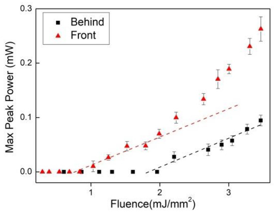 Maximum peak power per EFE for the 16 wt.% Nd2O3 sample for pumping in the powder surface from the front (red triangles) and for pumping from behind through the glass slide (black squares). Reprinted from reference [32].