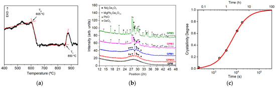 (a) DSC of GPM (10 wt% of Nd2O3) glass sample at heating rate of 10 °C/min (Tg = glass transition temperature, Tc = crystallization temperature). (b) X-ray diffraction for Nd3+-doped samples GPMx (x = 0.5, 1, 3, 5). (c) Crystallinity degree as a function of annealing time. Reprinted from reference [30].