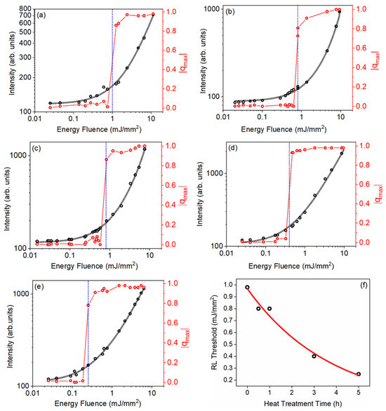 Modulus of the maximum Parisi overlap parameter (red curves) and PL intensity versus EFE at 1068 nm (black curves) for Nd3+-doped GPM samples. (a) GPM; (b) GPM05; (c) GPM1; (d) GPM3; (e) GPM5; (f) (EFE)th as a function of heat treatment time. The dotted blue line indicates the (EFE)th for each sample. Observe that (EFE)th is reduced from ~1 to ~0.25 mJ/mm when we compare the untreated glassy GPM sample with the one submitted to the crystallization treatment for 5 h. The results of (EFE)th as a function of annealing time in Figure 10f show clearly that the degree of crystallization is also correlated to the RL performance. Reprinted from reference [30].