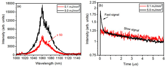 Figure 11a shows that the PL intensity at 1068 nm becomes about 130 times larger when the EFE is increased from 0.1 to 5.0 mJ/mm2 for the GPM5 sample. However, any significant reduction in the width of the emission band was observed. Figure 11b illustrates the PL dynamics below and above the (EFE)th for the GPM5 sample. Below (EFE)th, the signal decay time was in the μs range for all samples. For EFE > (EFE)th, a fast signal was observed, in the nanosecond range superimposed on the slower signal (in the μs range). The slow signal is due to the spontaneous emission by the ions that are not participating in the stimulated emission process. The temporal behavior observed from the other samples is like the one displayed in Figure 11b.