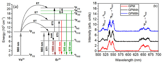 Figure 12a shows the Er3+ and Yb3+ energy levels contributing to the experiments, and Figure 12b shows the PL spectra obtained from GPM, GPM4h, and GPM8h samples.