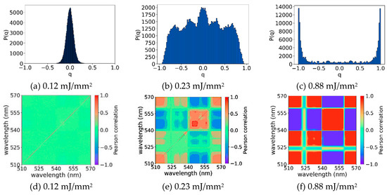 Figure 14a, obtained with EFE = 0.12 mJ/mm2, shows , which is consistent with the regime characterized by symmetric replicas expected for EFE < (EFE)th. This result is corroborated by the PCC calculations shown in Figure 14d. In this case, is nearly zero for the whole map, which indicates absence of correlations among the output intensity fluctuations. The thin red line along the diagonal represents self-correlations. As the EFE increases, the shape of P(q) changes. In Figure 14b for EFE = 0.23 mJ/mm2, shifts toward −1 and +1, which indicates anti-correlated and correlated fluctuations, respectively. However, a significant number of replicas are not correlated, as indicated by the large magnitude of P(q = 0), a situation where EFE (EFE)th. In Figure 14e, corresponding to EFE = 0.23 mJ/mm2, we observe in the PCC map a clear correlation (red) and anti-correlation (blue) between the emitted modes that share or compete for gain in the nonlinear regime, indicating the beginning of the laser regime. For a higher EFE (0.88 mJ/mm2), a complete RSB glassy state occurs, and the maximum of P(q) is observed at , as shown in Figure 14c. The PCC map of Figure 14f exhibits well-defined red and blue regions that, respectively, denote correlation and anticorrelation regions of the emitted modes, because of the high competition for the available gain. Similar behavior was observed for the samples GPM and GPM4h. These results are evidence that the RL regime was achieved for all samples.