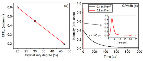 The dependence of (EFE)th with the degree of crystallinity is shown in Figure 15a, whereas in Figure 15b the PL dynamics at 547 nm, for excitation below (black line) and above (red line) the (EFE)th, for sample GPM8h, is presented. It is important to highlight that for EFE < (EFE)th the emitted PL was in the µs range, which is consistent with the spontaneous emission regime. On the other hand, for , only a fast signal in the nanosecond range was observed, which is evidence of stimulated emission regime. Notice that in previous work [40], we showed that slightly above (EFE)th, both the fast and slow signals were observed for glass and GC samples. However, in the present case, the intensity of the PL signal for was smaller than the detection limit of the photodiode used. The PL dynamics results were similar for the samples GPM and GPM4h.