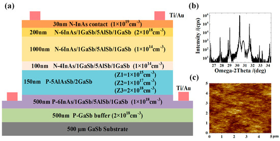 To better serve the application fields of eSWIR, a multitude of material systems have been studied. InGaAs based on an InP substrate lattice matching is commonly used for 1.7 μm detection. In order to expand the detection wavelength, the InGaAs needs to increase the In component, which leads to a lattice mismatch. Therefore, the defects of the material will cause serious degradation of the device performance [5]. The HgCdTe material has good wavelength tunability and can cover the eSWIR spectral region. However, the difficulty of growing HgCdTe materials (inhomogeneity and low yield), the high cost of the CdZnTe substrate, and the complex device manufacturing process make this solution insufficient for an inexpensive eSWIR detector [6]. Type-II superlattice (T2SL) materials have the advantages of strong bandgap adjustment flexibility, high carrier effective mass, and good growth uniformity in large areas [7]. InGaAs/GaAsSb T2SL structures can achieve a narrower bandgap than InGaAs or GaAsSb. Its lattice-matching growth on the InP substrate can greatly reduce the dislocation in epitaxy [8]. Sidhu et al. have successfully extended the wavelength of InGaAs/GaAsSb to 2.4 μm [9], and researchers are still trying to expand the wavelength. The M structure based on the InAs/GaSb/AlSb material system has greater carrier effective mass and greater bandgap tuning freedom [10]. A p-i-n homogeneous focal plane array imager based on InAs/GaSb/AlSb has been proved [1].