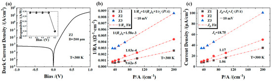 where JD is the total dark current density of the device, P is the mesa perimeter, and A is the mesa area of the device. As shown in Figure 2b, the JD (at −10 mV) of devices Z1, Z2, and Z3 were extracted. The JD of device Z1 is the smallest, and the JD of device Z3 is the largest. Subsequently, Equation (1) was used to fit the JD of different devices. The fitting results show that the Jb of devices Z1, Z2, and Z3 are 1.06 × 10−6 A/cm2, 1.17 × 10−6 A/cm2, and 1.875 × 10−5 A/cm2, respectively. Additionally, JD is also showing an increasing trend. The bulk differential resistance area (RA)b of the device is separated in the same way for the bulk detectivity calculation of the device. The fit uses the following equation [16]: