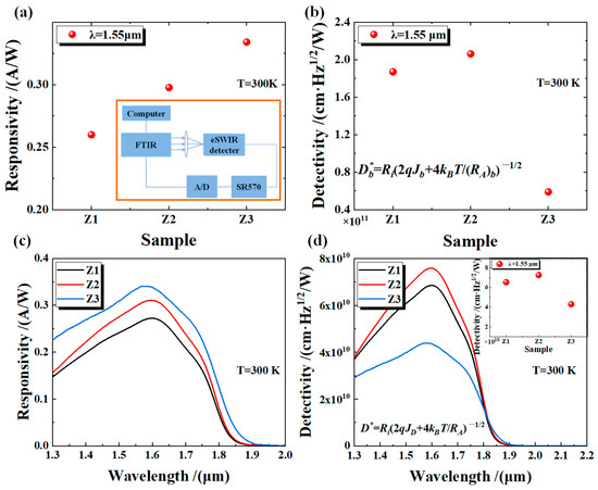 where Ri is the device responsivity, q is the fundamental charge, kB is the Boltzmann constant, and T is the device operating temperature (at 300 K). Figure 3b shows that the of devices Z1, Z2, and Z3 are 1.8 × 1011 cm·Hz1/2/W, 2.1 × 1011 cm·Hz1/2/W, and 5.9 × 1010 cm·Hz1/2/W, respectively. The of the device shows a trend of first increasing and then decreasing. Device Z2 exhibits the best comprehensive performance and has an improvement of 256% compared to device Z3. In addition, we also calculated the specific detectivity [17,18] of devices Z1, Z2, and Z3 (with a diameter of 1200 μm) under a full spectrum. As shown in Figure 3d, device Z2 has the highest specific detectivity (its dark current density is 9.48 × 10−6 A/cm² at a bias of −10 mV), and the peak specific detectivity is 7.59 × 1010 cm·Hz¹/²/W at 1.6 μm. Device Z2 improved by approximately 73% compared to device Z3. Table 1 shows the performance comparison between device Z2 and other eSWIR detectors. The specific detectivity of our device has certain advantages compared to other detectors. The detector proposed in this work demonstrates notable advantages and exhibits potential for the fabrication of high-temperature eSWIR focal plane array detectors.