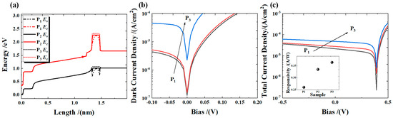 Figure 4a shows that the first and second electron barriers with a wide bandgap in the device structure can reduce the partial generation–recombination dark current. The second electron barrier can also block the passage of thermally excited electrons [4]. The valence band maximum energy Ev and the conduction band minimum energy Ec both shift upward as the doping concentration of AlAs0.1Sb0.9/GaSb increases. Figure 4b shows the simulation data of the dark current under different bias voltages. The results indicate that the dark current of the device increases with the rising p-type doping concentration in AlAs0.1Sb0.9/GaSb. This may be caused by the high hole concentration of AlAs0.1Sb0.9/GaSb. Under thermal excitation, holes pass through the first electron barrier region to reach the top contact layer, resulting in a larger dark current. Additionally, at the illumination of 1.55 μm, we can simulate the photocurrent data in Figure 4c. Under a −10 mV bias, the photocurrent increases with the increase of AlAs0.1Sb0.9/GaSb doping concentration. In the absorption region, photogenerated carriers (holes and electrons) are generated under optical excitation, with the top contact layer extracting electrons and the bottom contact layer extracting holes. Due to the upward shift of the Ev in the AlAs0.1Sb0.9/GaSb barrier, the photocurrent increases as the bottom contact layer extracts more photogenerated hole carriers. The simulated dark current densities of devices P1, P2, and P3 are 1.041 × 10−6 A/cm2, 1.445 × 10−6 A/cm2, and 1.929 × 10−5 A/cm2, respectively. These values exhibit close agreement with the bulk dark current density measured experimentally in Figure 2c. Similarly, the responsivity shown in Figure 4c aligns well with the experimental responsivity results from Figure 3a. These observations indicate that there is a difference in doping concentration between Be doped on GaAs and Be doped on AlAsSb/GaSb. Consequently, the actual doping concentration should be determined based on the simulation results. Therefore, the AlAsSb/GaSb doping concentration of Z1, Z2 and Z3 is 1.5 × 1016 cm−3, 5 × 1016 cm−3, and 1.5 × 1018 cm−3, respectively.