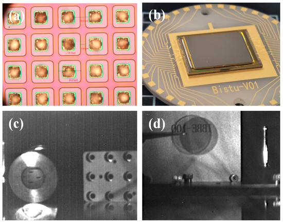 (a) Image of the In bump deposition optical microscope; (b) eSWIR FPA wiring test diagram; and (c,d) are eSWIR FPA images at 300 K.