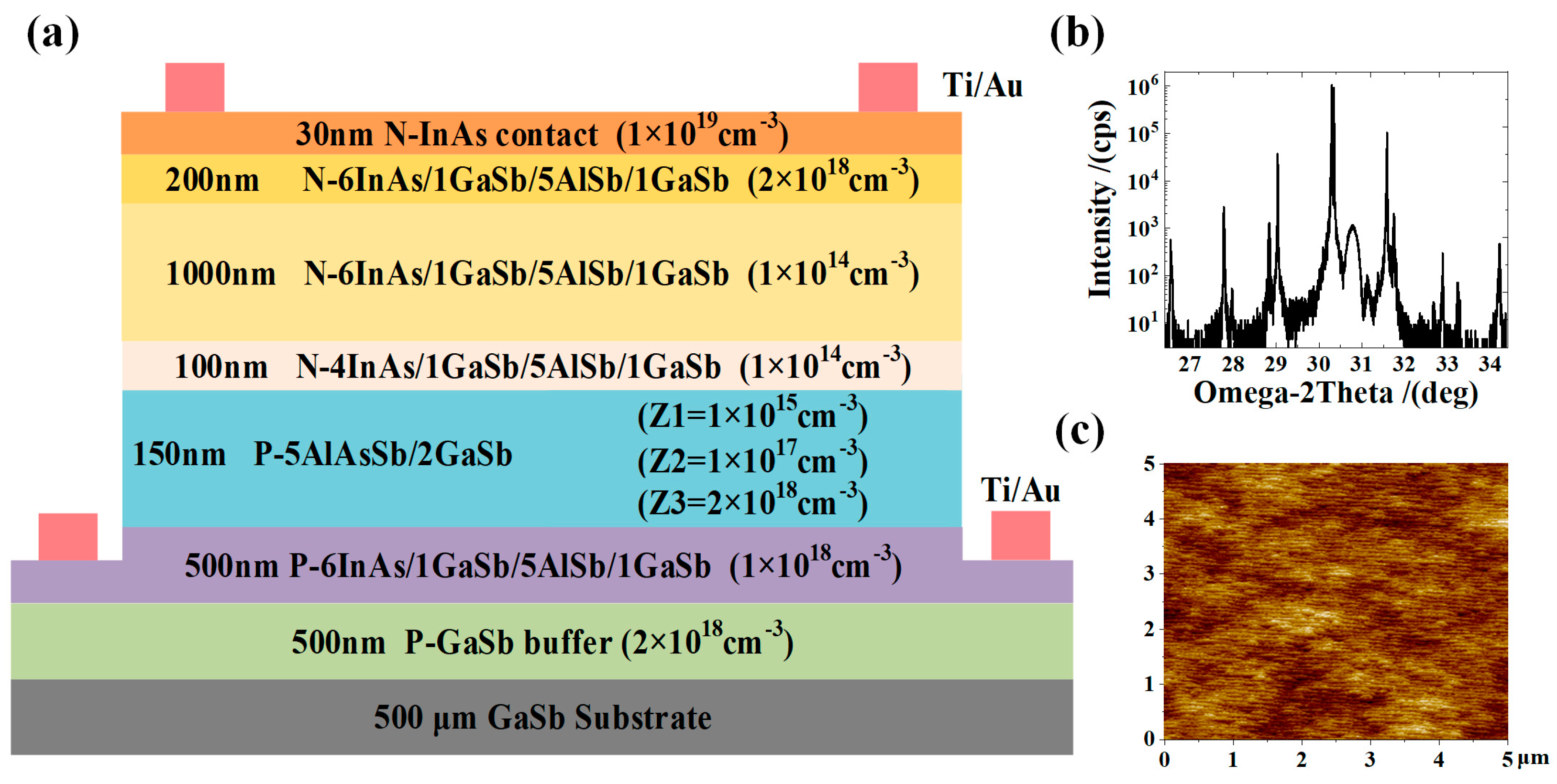 (a) Structure diagram of pBin eSWIR photodetector with Ti/Au metal contact layer. (b) HRXRD results of sample Z2. (c) The RMS roughness of AFM image is 0.125 nm in 5 × 5 μm2 area.