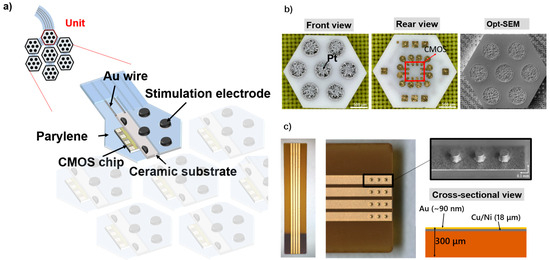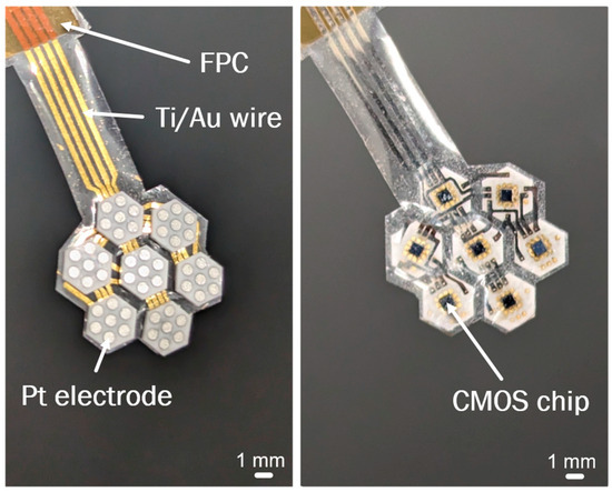 - Pan, K.; Hagiwara, T.; Tso, K.C.; Siwadamrongpong, R.; Akbar, L.; Nakano, Y.; Kono, T.; Terasawa, Y.; Haruta, M.; Takehara, H.; et al. A flexible retinal device with CMOS smart electrodes fabricated on parylene C thin-film and bioceramic substrate. Jpn. J. Appl. Phys. 2023, 62, SC1022. [Google Scholar] [CrossRef]