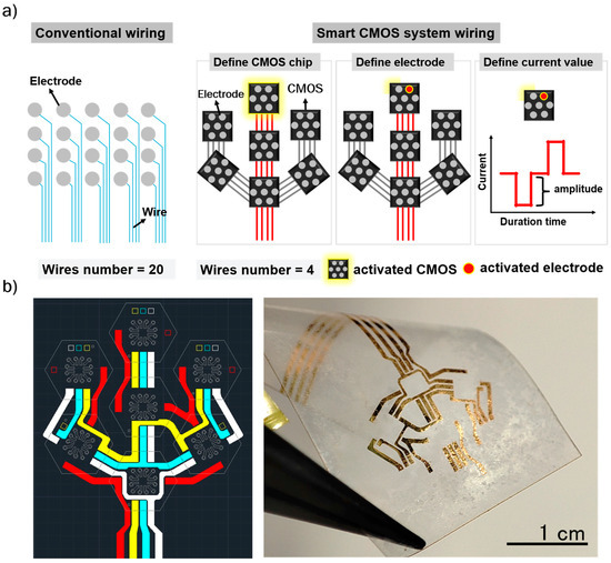 (a) Illustration of the wiring method using conventional and smart CMOS systems. (b) Wiring design and image of the wires for the flexible MMRD.