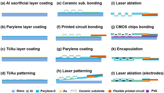 Figure 3 presents the fabrication flowchart of the flexible MMRD. A glass substrate served as the support for the device fabrication process. The glass substrate was cleaned by immersion in acetone and isopropanol for 10 min. This was followed by plasma treatment (50 W) using oxygen gas (O2) at a flow rate of 10 mL/min for 1 min to remove surface contaminants. Subsequently, a sacrificial aluminum (Al) layer (100 nm) was deposited on the glass substrate via evaporation deposition (VPC-260F, ULVAC). To create the primary supporting substrate for the device, a 5 µm thick layer of PaC was deposited on top of this Al layer via chemical vapor deposition (PDS 2010, Specialty Coating Systems, Indianapolis, USA). Next, a metal layer (50 nm Ti/100 nm Au) was deposited by sputtering to serve as the wiring for the device. The Ti/Au metal layer was then patterned using photolithography (Mikasa-M30, Minato, Japan) and chemical etching (the etching solutions are listed in Table S1). The ceramic substrates were mounted on the Ti/Au wires through a flip-chip bonding process (M-90, HiSol, Taito, Japan). The ceramic and FPC substrates were connected to the Ti/Au wires using an anisotropic conductive paste (TAP0402E, Kyocera, Kyoto, Japan) under 11 N of pressure at 130 °C for 60 s. Following this, a second PaC layer was deposited to encapsulate the Ti/Au wires. Prior to PaC encapsulation, both the Au interconnects and the initial PaC layer were treated with a silane solution at 25 °C for 15 min to enhance adhesion between the two PaC layers. After the second PaC layer was applied, the device was cut by UV laser ablation using a Q-switched Nd:YAG (neodymium-doped yttrium aluminum garnet) laser at a wavelength of 266 nm, which was utilized as a lift-off process to detach the device from the supported glass substrate. This was followed by a lift-off process in an alkaline solution (1 M sodium hydroxide) to remove the sacrificial Al layer, as shown in Figure 3h. For the CMOS flip-chip process, the PaC layer covering pads at the ceramic substrate for CMOS chip bonding was selectively removed by the UV laser combined with O2 plasma treatment. Before the flip-chip bonding process for CMOS chips, the sample was fixed on glass supporting substrate using polyvinyl alcohol (PVA). The flip-chip bonding was then performed under the same conditions as those used for the ceramic substrates. Finally, after detaching the sample from the glass substrate by dissolving the PVA in water, a second silane coupling modification process was performed. Subsequently, a third PaC layer was deposited for final encapsulation, and UV laser exposure was used to reveal the electrodes.