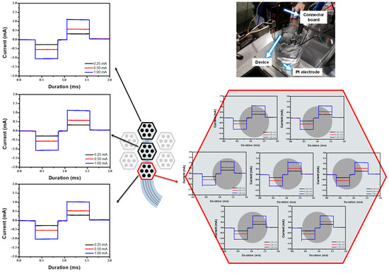 To evaluate the device’s operation and performance, it was operated at various input currents to verify that the stimulating waveform and current value matched the designed input currents. To achieve charge-balanced neural stimulation, a cathodic-first biphasic current stimulation waveform was applied. The current response ranged from 250 to 1000 μA, with a pulse duration of 0.5 ms and an interpulse interval of 0.2 ms, as shown in Figure 6. Figure 6 shows an identical stimulation waveform with varying output currents among the three modules, as well as the respective stimulation waveforms for the seven electrodes within each module. Devices manufactured using the improved process operated the stimulation waveform successfully in PBS experiments. Minor overshoots of currents were observed during both positive and negative stimulation signal outputs. These overshoots are assumed to result from the release of the charge accumulated at the floating potential when switching the connection between the stimulation circuit and the counter electrode (in the floating control method). Since these overshoots are transient and involve a minimal amount of total charge, they are considered to have a negligible impact on biological tissues. These results indicated that the device, fabricated using the improved process, is suitable for the next stage of performance evaluation: in vivo experimentation.