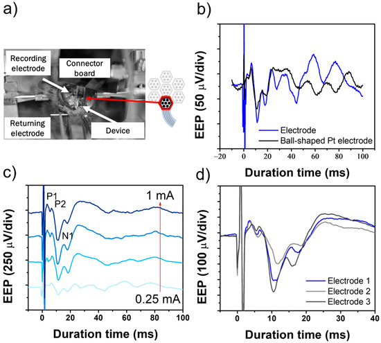 In vivo evaluation of the flexible MMRD in the rat experiment. (a) Setup of the EEP experiment. (b) Comparison of EEP signals using a ball-shaped electrode versus a fabricated device electrode. (c) EEP signals obtained with stimulation currents ranging from 0.25 to 1.0 mA. (d) EEP signals obtained with different electrodes at 1.0 mA stimulation current.