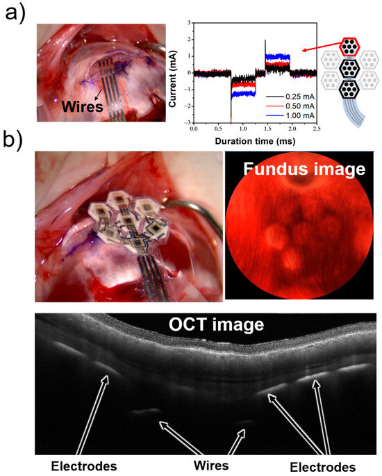 Following the aforementioned experiments and in preparation for future devices with a higher number of electrodes, we implanted a seven-module device into an extracted rabbit eye. The optical coherence tomography (OCT) and fundus images obtained during this procedure are shown in Figure 8b. These images indicate that the device can be successfully implanted in the desired position using the STS method. These experimental results demonstrate that the artificial retinal device developed in this study can effectively stimulate the retina (even when modularized). Furthermore, the STS method allows for precise implantation at the intended positions. All animal experiments were conducted in accordance with the protocols approved by NIDEK Co., Ltd.