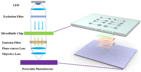 To achieve highly sensitive fluorescence detection of nucleic acids within a microfluidic chip, a vertically aligned integrated optical detection system was constructed, as illustrated in Figure 1. This system employs a vertically aligned optical path comprising, from top to bottom, a fluorescence excitation module, a microfluidic chip module, a signal collection system, and a perovskite photodetector (detection module). The fluorescence excitation module consists of a 470 nm blue LED (REE, Durham, NC, USA) and an excitation filter (ET470/40x, Chroma, CA, USA), generating excitation light of a specific wavelength to stimulate fluorescent labels within the sample. The microfluidic chip module processes biological samples, including pathogen lysis, washing, and purification (see Section 2.1.2 for a detailed description of the chip structure and extraction process). The fluorescence signal collection system first employs an emission filter (ET525/50m, Chroma, CA, USA) to eliminate non-target wavelengths and stray excitation light. A plano-convex lens (f = 15 mm, JCOPTIX, Nanjing, China) collimates the divergent light into a parallel beam, which is then focused using a microscope objective lens (0.45 NA, 20×, 26.5 mm, Olympus, Tokyo, Japan) onto the photosensitive area of the perovskite photodetector (Figure 1). Finally, the perovskite photodetector converts the fluorescence signal into an electrical signal for digital output.