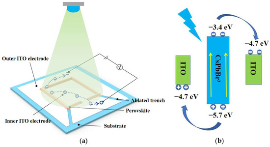 The structure of the perovskite photodetector developed in this study is shown in Figure 2a. Nanosecond pulsed laser ablation was employed to precisely define the conductive pathways of the ITO layer. As illustrated in Figure 1, under focused laser irradiation, the surface of the ITO was gradually ablated, and the irradiated regions of the ITO film were completely removed, thereby exposing the underlying glass substrate. Owing to the excellent conductivity of the ITO layer, this laser ablation process created electrical isolation in the trench regions, effectively dividing the ITO into two separate regions: an inner electrode located within the perovskite-patterned area and an outer electrode surrounding it. During the ablation process, the electrode layout was carefully optimized to maximize the contact area between the perovskite active region and the outer electrode, thereby enhancing charge transport efficiency and improving the device’s photoelectric conversion performance. A CsPbBr3 perovskite thin film was subsequently deposited in the patterned region, forming a bridging structure between the inner and outer electrodes. Upon illumination, the perovskite layer absorbs incident photons and generates electron–hole pairs. Under the applied external bias, the photogenerated electrons and holes are driven toward their respective electrodes, resulting in a measurable photocurrent in the external circuit. Figure 2b further explains the energy band structure and carrier transport pathways under illumination. When the energy of the incident photons exceeds the bandgap of CsPbBr3, electrons in the valence band are excited to the conduction band, forming electron–hole pairs. The excited electrons occupy conduction band energy levels near −3.4 eV and tend to migrate toward the right ITO electrode, which provides favorable energy alignment for efficient electron injection and collection. Simultaneously, the holes stay in the valence band (approximately −5.7 eV) and migrate toward the left ITO electrode, whose work function (approximately −4.7 eV) is energetically favorable for hole collection. When the external circuit is closed, electrons flow from the right ITO electrode to the left through the external circuit and recombine with holes at the left ITO electrode, thereby generating a stable photocurrent.
