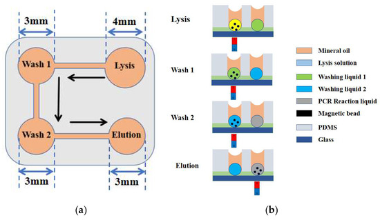 As illustrated in Figure 3a, the microfluidic chip for nucleic acid extraction based on magnetic bead-based methodology [24] consists of four functional chambers: the lysis chamber, the first washing chamber, the second washing chamber, and the elution chamber. These chambers are sequentially used for pathogen lysis, primary washing, secondary washing, and nucleic acid elution using magnetic beads, respectively. The detailed extraction and purification workflow is shown in Figure 3b. Initially, pathogens were lysed in the lysis chamber by the action of a lysis buffer, resulting in the release of nucleic acids, which were subsequently adsorbed onto the surface of magnetic beads via electrostatic interactions. Then, the magnetic beads carrying the nucleic acids were transported by an external magnetic field through the first and second washing chambers to remove impurities generated during the lysis process. Finally, nucleic acids were eluted from the magnetic beads using an elution buffer in the elution chamber.