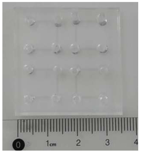 The microfluidic chip used in this study was fabricated using a maskless photolithography technique. First, SU-8 3050 negative photoresist was spin-coated onto a silicon wafer, followed by patterning exposure using a UV lithography system (MicroWriter, Durham Magneto Optics, Cambridge, UK). After development, a silicon-based mold with the desired microstructures was obtained. Subsequently, polydimethylsiloxane (PDMS) prepolymer and curing agent were mixed in a 10:1 weight ratio and degassed under vacuum to remove air bubbles. The degassed mixture was then poured onto the silicon mold and cured at 65 °C for 4 h. After curing, the PDMS layer was peeled off, and through-holes were created at designated positions using a biopsy punch. Finally, the PDMS layer was plasma-bonded to a glass substrate via plasma treatment to form the nucleic acid extraction microfluidic chip. The assembled chip was then placed in an oven at 65 °C for 12 h to further enhance the bonding strength at the PDMS–glass interface. A photographic image of the fabricated microfluidic chip is shown in Figure 4.