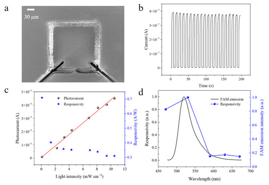 Figure 5c shows the photocurrent response of the device under 530 nm illumination at varying light intensities of illumination. As the incident power density increased from 0.01 mW cm−2 to 10.24 mW cm−2, the photocurrent exhibited linear growth, indicating good linearity over a broad range of illumination intensities. This behavior can be explained by the photogeneration of electron–hole pairs [25]: as light intensity increases, more photons are absorbed by the perovskite film, leading to the generation of more photocarriers and, consequently, enhanced photocurrent output. The figure also shows the device responsivity (defined as the ratio of photocurrent to incident optical power). A decreasing trend in responsivity is observed with increasing light intensity, which can be attributed to enhanced carrier recombination rates [26] that limit further photocurrent increase, resulting in a sublinear responsivity behavior. Figure 5d illustrates the wavelength-dependent responsivity of the device along with the emission spectrum of FAM fluorescent dye (See Supplementary Materials for details). The CsPbBr3 photodetector exhibits a peak responsivity at 530 nm, which closely matches the primary emission wavelength of FAM. This excellent spectral alignment confirms the device’s capability for efficient FAM fluorescence detection, providing a solid foundation for high-sensitivity signal acquisition in nucleic acid detection systems.
