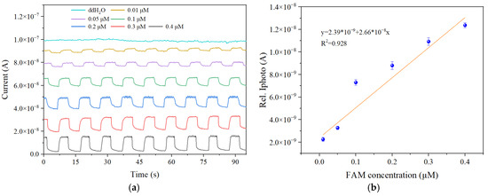 To obtain accurate response values, the current data during each excitation phase and dark stabilization phase were averaged, and the difference between the two was used to extract the effective photoresponse signal (as shown in Figure 6b). Within the FAM concentration range of 0.01 μM to 0.4 μM, the system exhibited a strong linear relationship between photocurrent and concentration. The linear fitting equation was y = 2.39 × 10−9 + 2.66 × 10−8 x, with a correlation coefficient of R2 = 0.928, indicating strong linearity.