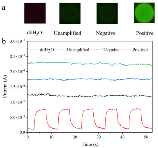 (a) Fluorescence imaging of the tested samples: ddH2O, unamplified sample, negative sample, and positive sample (from left to right); (b) time-resolved output current curves measured by the fluorescence detection system.