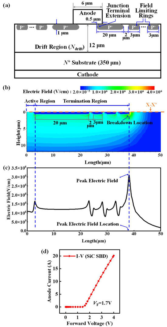This study utilizes TCAD numerical simulation results to construct the dataset. Figure 1 illustrates the schematic of the 4H-SiC SBD used in this research, featuring JTE and FLR, which is widely used in mitigating the electric field concentration effect at the edge of the p-type cell [22]. The substrate exhibits a thickness of 350 μm and a doping concentration of 1 × 1019 cm−3 [23]. The drift region has a thickness of 12 μm, while FLR width and spacing are 3 μm and 2 μm, respectively [24,25]. Employing a two-dimensional simulation structure significantly reduces the computational workload, enhancing simulation speed. We chose a comprehensive physical model to ensure predictive accuracy while maintaining simulation efficiency. In the simulation process, the basic physical models of 4H-SiC were employed [26,27,28,29,30]. These primarily comprise the Slotboom model for bandgap narrowing, the Auger recombination model, the Shockley–Read–Hall (SRH) model with doping dependence, the avalanche model based on the Okuto equation, the high field saturation model, and the incomplete ionization model. The anisotropic properties of 4H-SiC and barrier-lowering effects were also considered. As shown in Figure 1b,c, breakdown occurs at the endpoint of the limiting ring, effectively mitigating the concentration of the electric field near the PN junction [31]. The line profile of the electric field in Figure 1c is extracted from the X-X′ cutline in Figure 1b, which is the interface between the metal and SiC drift layer. The electric field distribution and voltage peak location are consistent with the results of existing simulation studies [32]. Furthermore, during the simulation process, we calibrated the device characteristics by referencing tape-out results from existing studies. As shown in Figure 1d, the calibrated 1200 V SiC SBD device exhibited a forward conduction voltage (VF) of 1.7 V, demonstrating high consistency with prior research and, thus, validating the reliability and precision of the dataset [33].