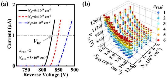 (a) Numerically simulated reverse characteristics of the devices with different NA. Vbr is the reverse voltage at a current of 1 × 10−6 A. (b) Vbr values of the devices with different Ndrift, NA, and nFLR.