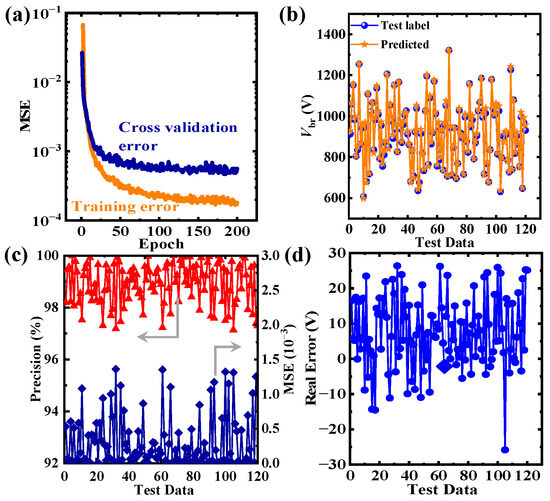 The TCAD simulations required 1.87 × 106 seconds to generate 600 breakdown voltage datasets. However, as shown in Figure 4a, the CNN model achieved a training set MSE of 2 × 10−4 following 200 epochs of training completed in 18 s using an AMD Ryzen 3700X (AMD, Santa Clara, CA, USA) processor. This demonstrates that the CNN model can maintain high efficiency in training data incorporating complex physical models. Moreover, the cross-validation set maintains a low gap with the training error in the 200th epoch, indicating non-overfitting calculations. Figure 4b compares predicted Vbr values with test data, revealing negligible discrepancies for each test sample. This similarity suggests that predicted Vbr and actual values (Test label) share nearly identical distributions. Figure 4c displays the prediction precision and MSE of the test set samples, with the CNN achieving over 97% precision and an MSE below 1.5 × 10⁻3 across 120 test cases. The low MSE further confirms minimal deviation between the predicted and actual values, with most prediction accuracies reaching 98.5%, underscoring the model’s high efficiency and accuracy. The training process yields a stable model with a strong correlation between Vbr and the corresponding parameters. Figure 4d shows that the actual error between the predicted values and the test set labels remains below 30 V, with the majority of errors confined within 15 V, further demonstrating the model’s capability to reliably predict the breakdown voltage of SiC SBDs.