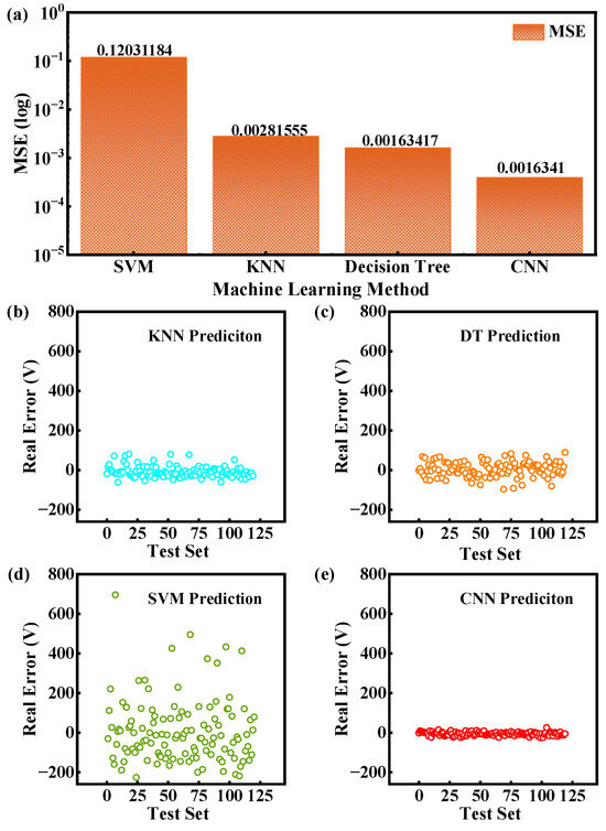 (a) The comparison of the MSE of the test set for methods, including SVM, KNN, decision tree, and CNN. (b–e) Comparative analysis of the prediction errors between KNN, decision tree, SVM, and CNN methods.