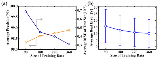 (a) The evolution of precision and MSE under the training set sizes of 90, 180, 270, and 360. The reduced MSE and increased precision indicate a more accurate prediction model. (b) Average real error versus the size of the training data.