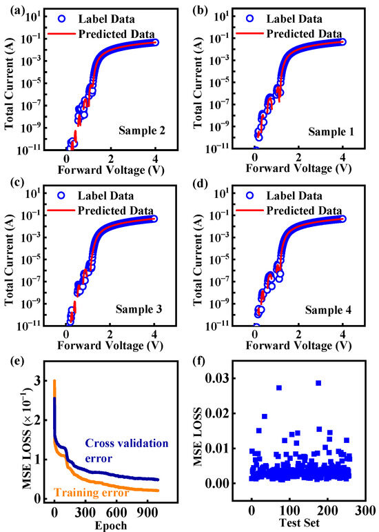Figure 7a–d present four randomly selected samples from the prediction results, showing that the predicted values are almost identical to the original data. Figure 7e illustrates the declining trend of training loss and cross-validation loss during the training process. The results show that after about 1000 iterations of the results, the model achieves an MSE loss of less than 6 × 10−2 on both the training set and the cross-validation set. Figure 7f shows that the MSE loss on the test set is primarily concentrated at around 1 × 10−3, exhibiting high precision for deep learning-based models in predicting the forward I-V curves of SiC SBDs.