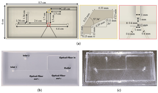 The geometry of the micro-optofluidic (MoF) device employed in this work was designed through appropriate simulations, and further details have been provided in previous studies [39,40]. Briefly, the device features two interconnected microchannels forming a T-junction for the slug-flow formation. It includes two inlets for introducing the fluids into the microfluidic channel and a single outlet for fluid discharge. The optical component of the MoF device consists of a micro-optical light splitter, used as a waveguide to reorient a light beam, along with three optical fiber insertions, schematized in the figure by gray-colored cylinders. The input optical fiber (see Figure 1, upper-right corner) conveys the light source to the microsplitter, which provides as output a cone-shaped beam of light with a direction angle of about [39] because of its numerical aperture toward the microchannel’s investigation region. As the light interacts with the two fluids that compose the slug flow, the optical signals are captured by two output optical fibers arranged on the opposite side of the microchannel (see Figure 1, bottom part). The two output optical fibers are positioned at an angle of relative to the vertical direction in order to align with the light beam coming from the light source. The details regarding the design optimization process through optical simulation are provided in [39], and the precise dimensions of the MoF device are reported in Figure 2a.