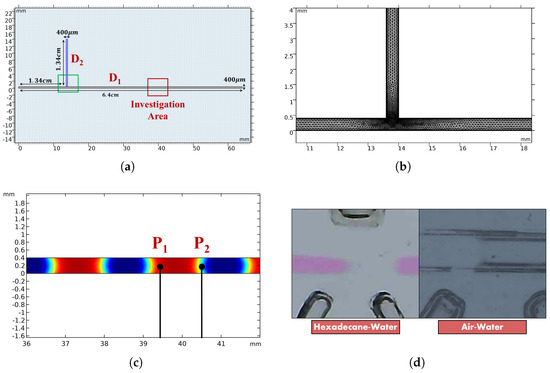 (a) Micro-optofluidic device geometry. (b) Close-up view of the mesh distribution involved in the CFD simulation environment at the T-junction. (c) Locations of and , representing the observation points in the model used to simulate the presence of the two photodiodes. (d) Investigation areas of both the hexadecane–water and air–water processes.
