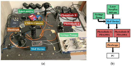 The system employed to generate the slug flow through the micro-optofluidic device is schematically represented in Figure 4b. It consists of (i) a hydrodynamic system used to introduce fluid samples into the MoF device; (ii) an optical actuation system comprising a light source delivered to the device via an input optical fiber; (iii) the micro-optofluidic device; (iv) an optical detection system utilizing a photodiode connected to the output optical fibers; (v) a scientific camera for image acquisition; and (vi) a computer equipped with dedicated software for optical data analysis. The experimental setup is shown in Figure 4a.
