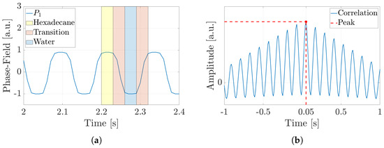 Numerical results of CFD simulations. (a) Hexadecane slug presence—high level highlighted in yellow; water slug passage—low level depicted in blue; and transition between these two events, displayed in red. (b) Cross-correlation between the phase-field variables and to compute their time delay.