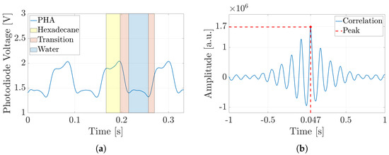 Experimental result trends of the optical signals acquired by PHA (Photodiode-A) for hexadecane–water slug flow in Subset 1, with an input flow rate of 0.1 [mL/min]. (a) Hexadecane slug presence—high level highlighted in yellow; water slug passage—low level depicted in blue; and transition between these two events, displayed in red. (b) Cross-correlation between the optical signals of PHA and PHB (Photodiode-A and Photodiode-B) to compute their time delay.