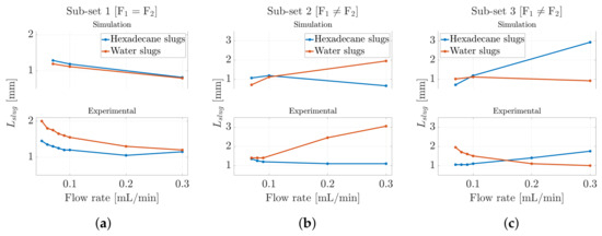 Following the determination of the slug velocities, both in the experimental scenario and within the CFD model employed, we investigated the slug length, a critical hydrodynamic parameter that significantly influences inter-slug mass transfer in segmented flow or mixing scenarios [58]. Indeed, both the slug velocity and the slug length between the two phases determine the nature of internal circulation within the slug. Specifically, knowing the slug velocity, the sampling period of the optical signal/phase-field variable (see Figure 5a and Figure 6a), and the number of samples corresponding to a single slug level within the square wave , it was possible to determine the slug length using Equation (7). In this case, as with the determination of the slug velocity, the same methodology was applied to both the experimental and CFD models, allowing for a direct comparison between the two. The results are shown in Figure 8 for all three subsets considered in this work. It was found that the experimental values were in closer agreement with the numerical predictions. The results showed that the slug length ranged from 1 [mm] to 3 [mm] in both the CFD model and the experimental context for both fluids, confirming the validity of the methodology used to determine this parameter. In Subset 1, we observed that the slug length tended to decrease as the input flow rate increased. Initially, the slug lengths of the two phases were distinct from one another; however, as the input flow rate continued to increase, the slug lengths for both phases converged toward the same value. Conversely, when the input flow rates were unequal, as seen in Subset 2 and Subset 3, slight discrepancies arose between the experimental data and the simulation results. The CFD model showed a slug-length inversion occurring almost when the two flows became equal, whereas in the experimental scenario, a clear imbalance in the flows was necessary for the inversion to take place, as illustrated in Figure 8c.