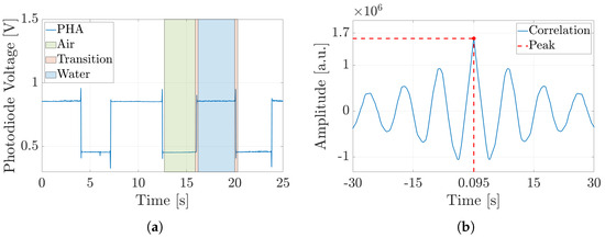 Experimental result trends of the optical signals acquired by PHA for air–water slug flow in Subset 1, with an input flow rate of 0.1 [mL/min]. (a) Air slug presence—low level highlighted in green; water slug passage—high level depicted in blue; and transition between these two events, displayed in red. (b) Cross-correlation between the optical signals of PHA and PHB to compute their time delay.