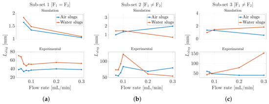 Unlike the previous scenario, a noticeable discrepancy of more than one order of magnitude was observed between the experimental results and those derived from the CFD model. In particular, the numerical simulation predicted shorter air slug lengths, whereas the experimental observations showed significantly longer air slugs. Generally, the slug length was influenced by the dynamics of dispersed-phase detachment at the T-junction, where the two phases interact. As discussed in the previous section regarding slug velocities, the compressibility of air played a critical role in these detachment dynamics. This phenomenon may result from increased pressure and flow oscillations caused by air compressibility, which slowed the alternation between the two phases within the microchannel. Such dynamics can delay the breakup of air slugs, a factor not accounted for in the idealized CFD model. Furthermore, pressure disturbances generated by the incoming liquid flow, which dominate the slug breaking mechanism, were not captured numerically. Additionally, it is evident in both scenarios that water dominated the microchannel, with a greater presence relative to air. This can be observed in Subset 1, where water length consistently exceeded air length even with equal input flow rates (see Figure 11a). Similar patterns were observed in the slug-length inversion points in Subset 2 and Subset 3, which only occurred when the air input flow rate exceeded that of water (see Figure 11b,c).