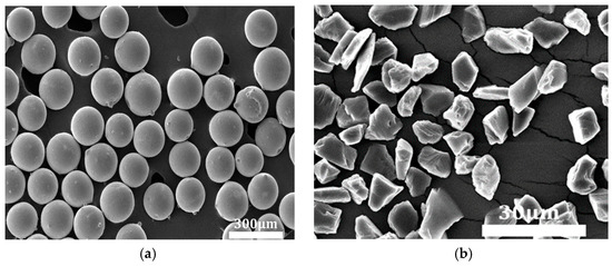 SEM images of spherical iron powder and Al2O3 powder. (a) Metal matrix; (b) Al2O3 hard abrasive powder.