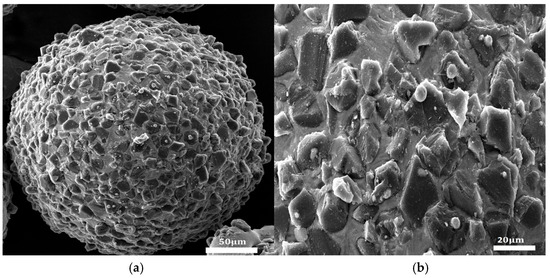 Outstanding magnetic permeability and superior grinding performance are critical for the fabrication of high-performance magnetic abrasives. To ensure process stability during machining, ferromagnetic spherical powder, as illustrated in Figure 2a, was selected as the metallic matrix material. Additionally, the choice of hard abrasives plays a crucial role in the overall effectiveness of the grinding process. As shown in Figure 2b, aluminum oxide (Al2O3) is widely utilized across various fields due to its exceptional properties, including high hardness, low density, excellent thermal stability, and corrosion resistance [21,22].