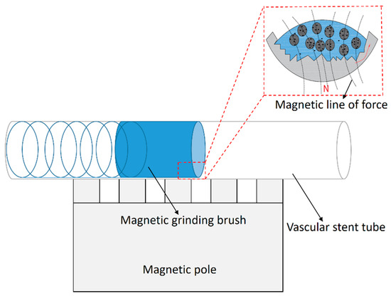 Figure 4 illustrates the principle of magnetic polishing processing for the inner wall of vascular stent tubes. Initially, a suitable amount of magnetic abrasive is injected into the interior of the MP35N cobalt–chromium alloy vascular stent tube, which is then sealed at both ends and securely clamped using precision chucks mounted on a servo motor. Under the influence of the magnetic field, the magnetic abrasives within the tube align along the magnetic field lines, forming a flexible magnetic polishing brush. Given that the hardness of the hard particles on the magnetic abrasives is typically much greater than that of the workpiece material, when the magnetic field is applied, these hard particles penetrate the surface of the workpiece, creating indentations and a pressing effect. Subsequently, the tube begins to rotate, while the magnetic poles move back and forth along the tube’s axis, resulting in a helical motion trajectory of the magnetic polishing brush relative to the inner wall. The contact between the hard particles and the workpiece surface generates sliding, cutting, and plowing actions, thereby achieving micro-machining of the tube’s inner wall and facilitating precise material removal.