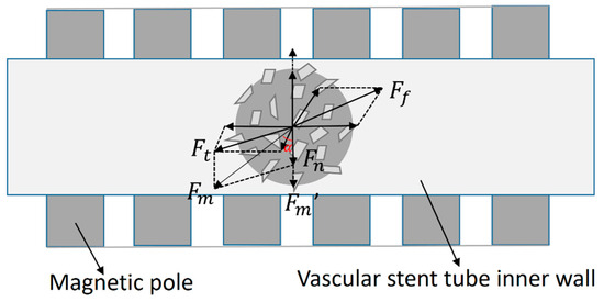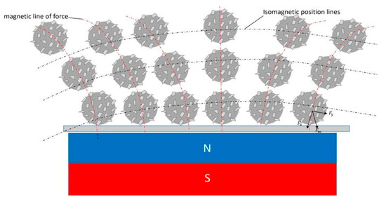 As illustrated in Figure 5, the magnetic abrasive particles within the tube align along the magnetic flux lines under magnetic field forces, forming a flexible magnetic abrasive brush. Each magnetic abrasive particle experiences dual electromagnetic components: tangential force along the magnetic flux lines and normal force perpendicular to the magnetic equipotential lines. The resultant magnetic force , calculated through the vector superposition of these components, initially manifests as a vertically downward orientation perpendicular to the target surface before machining initiation. This pre-machining configuration induces localized plastic deformation through surface indentation, as documented in previous studies [23,24].