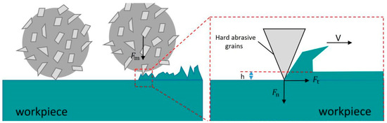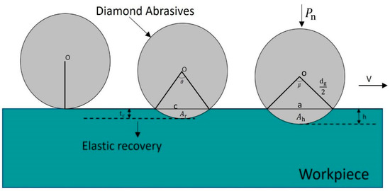 As illustrated in Figure 8, the abrasive–workpiece contact mechanics follows an elastic–plastic framework.