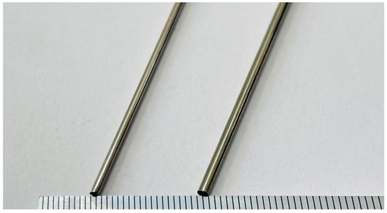 The MP35N cobalt–chromium alloy vascular stent tube used in the experiment is depicted in Figure 10. Its outer diameter is 1.8 mm, inner diameter is 1.6 mm, and length ranges from 1800 mm to 2000 mm. The composition and certain performance specifications of the alloy are detailed in Table 2 and Table 3. It is particularly noteworthy that the MP35N cobalt–chromium alloy is non-ferromagnetic, thus eliminating concerns regarding interference between the magnetic poles and the workpiece.