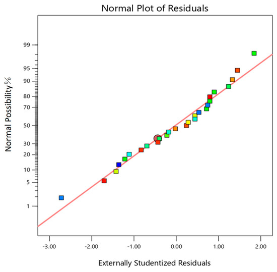 As illustrated in Figure 11, the residuals of the model exhibit a nearly linear pattern in terms of normal distribution. This indicates a strong alignment between the predicted and actual values of surface roughness, suggesting that the residuals follow a normal distribution and that the model demonstrates good adaptability.