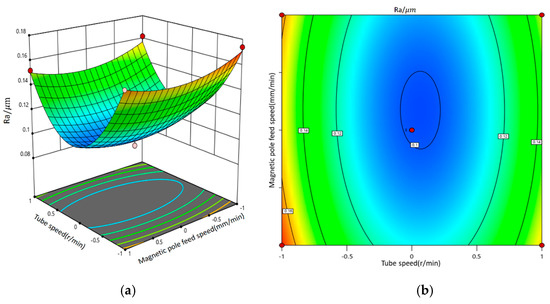 The interaction diagram of pipe speed and magnetic pole feed speed and its impact on surface roughness. (a) Three-dimensional response surface diagram; (b) contour map.
