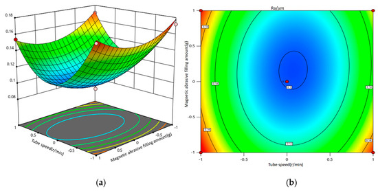 The interaction diagram of pipe speed and magnetic abrasive filling amount and its impact on surface roughness. (a) Three-dimensional response surface diagram; (b) contour map.