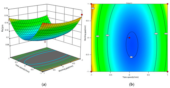 Interaction diagram of tube speed and machining gap and its impact on surface roughness. (a) Three-dimensional response surface diagram; (b) contour map.
